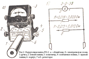Нагрузочная вилка модели ЛЭ-2 позволяет определить напряжение в каждом элементе батареи. Нагрузочная вилка состоит из нагрузочных резисторов 7 и 8 (рис.2), смонтированных между ножками 4 вилки и вольтметра 3. Нагрузочные резисторы вилки подбирают в соответствии с ёмкостью АКБ.