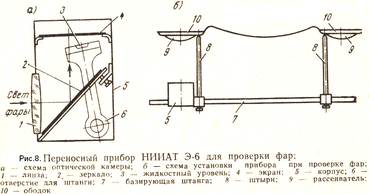 Для проверки правильности установки фар следует пользоваться прибором модели НИИАТ Э-6 (рис.8).