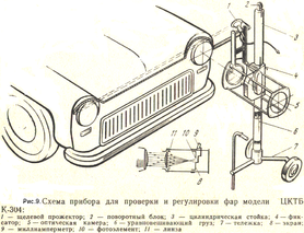 Центральным конструкторско-технологическим бюро Минавтотранса РСФСР разработан более совершенный прибор для проверки и регулировки фар автомобилей модели ЦКТБ К-304 (рис.9).