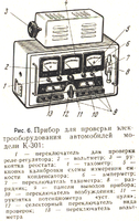 Прибор К-301 (Рис.6) является модернизацией прибора НИИАТ Э-5 и предназначен для проверки следующих элементов электрооборудования номинальным напряжением 12 и 24В: АКБ; генераторов постоянного и переменного тока с встроенными диодами мощностью до 500 Вт; реле-регуляторов всех типов; прерывателей-распределителей; конденсаторов; катушек зажигания цепей низкого напряжения; стартеров мощностью до 2 л. с.