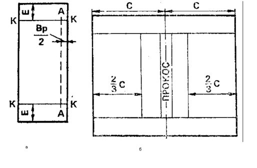 При движении с расширением прокосов (рис. 1,б и 2,б), скашивание начинают с прокоса между смежными загонами, и последовательно расширяет его, выкашивая длинные стороны первого и второго загонов. Когда ширина прокосов достигнет ширины каждой из оставшихся нескошенных частей первого и второго загонов, докашивают с обеих сторон первый, а затем второй загон.