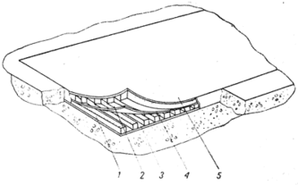 Мат набирается из слоёв проводящего эластомерного материала 5, 3, 4, разделенный полосками из диэлектрического эластомерного материала 2, 1, таким образом, что образуется электрический конденсатор, емкость которого линейно зависит от приложенной к мату нагрузки. Взаимно перпендикулярное расположение диэлектрических полосок служит для увеличения линейного участка изменения емкости. Электрические слои (обкладки конденсатора) 5 и 3 соединены вместе и образуют одну обкладку, соединенную с общей шиной прибора. Слой 3 является второй обкладкой конденсатора. Электронная аппаратура позволяет измерять изменение емкости при нагружении мата и получать показание, соответствующее величине нагрузки [3, с. 33].