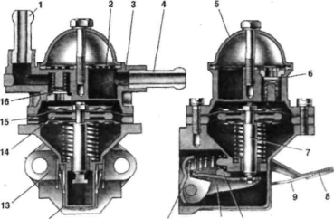 Паливний насос Рис. 1.2 диафрагмового типу, призначається для подавання палива з бака в поплавцеву камеру карбюратора. Встановлюється на лівій стороні блоку циліндрів і приводиться в дію штовхачем від ексцентрика вала приводу оливного насоса і розподільника запалювання. Для заповнення системи паливом мається важіль ручного підкачування палива 8. [1].