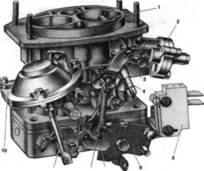1 – повітряна заслінка; 2 – пусковий пристрій; 3 – трьохплечий важіль керування повітряною заслінкою; 4 – телескопічна тяга; 5 – мікроперемикач; 6 – важіль приводу дросельних заслінок; 7 – важіль, що обмежує відкриття дросельної заслінки другої камери; 8 – поворотна пружина; 9 – шток пневмоприводу; 10 – пневмопривод дросельної заслінки другої камери
