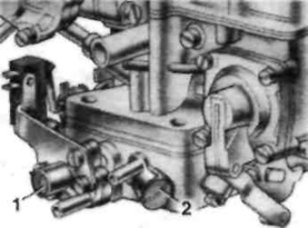 Елементи регулювання холостого ходу двигуна включають гвинт 2 (рис. 2.1.), що визначає склад суміші, і гвинт 1, що регулює кількість суміші.