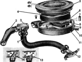3 – терморегулятор; 4 – фільтруючий елемент; 5 – кришка; 6 – пластина кріплення фільтра; 7-дистанційна втулка; 8 – прокладка; 9 – патрубок для відводу картерних газів до золотникового пристрою карбюратора; 10 – витяжний колектор картерних газів; 11 – корпус повітряного фільтра; 12 – повітрозабірник теплого повітря;