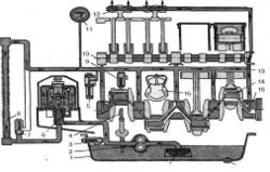 1 – масляний піддон; 2 – масляний насос; 3,7,9, – редукційні клапани; 4 – масломірна лінійка (стержень); 5 – проміжна шестерня; 6 – масляний фільтр (центрифуга); 8 – масляний радіатор; 10 – розподільний вал; 11-манометр; 12 – валик коромисел; 13 – головний масляний канал; 14 – порожнина шатунної шийки; 15 – колінчастий вал; 16 – маслозаливна горловина; 17 – пробка зливного отвору; 18 – маслоприймач