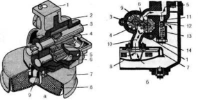 Повнопоточна реактивна масляна центрифуга (рис. 5) дизеля СМД-60 складається з нерухомої і рухомої (ротора) частин і змонтована в корпусі 1 (рис. 5, б). В корпус 1 вкручено пустотілу вісь 6 з нижньою 31 і верхньою ЗО опорними шийками. На осі нерухомо (за допомогою гайки 10) закріплюється захисний ковпак 12, а ротор – з можливістю обертання відносно осі і вісьовим переміщенням 0,2–0,6 мм за допомогою гайки 8, упорної шайби 9 і гайки 11. Між ковпаком 12 і корпусом 1 встановлюється ущільнювальна паронітова прокладка 15.