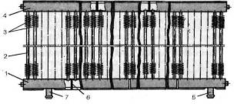 1,4 – верхній і нижній бачки; 2 – овальні трубки; 3 – ребра; 5,7 – вхідний і вихідний патрубки; 6 – перетинки канал центрифуги з каналами насадки, та чотири радіальних отвори в колонці 8 остова ротора, що з'єднують канали насадки з робочим об'ємом ротора центрифуги.