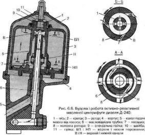 Частина масла з верхньої частини ротора подається до форсунок. Витікаючи з великою швидкістю через соплові отвори форсунок, масло утворює реактивний крутний момент (рис. 5, в) який обертає ротор центрифуги. При обертанні ротора з великою швидкістю механічні частинки і продукти спрацювання масла під дією відцентрових сил відкидаються до стінок кришки і осідають у вигляді спресованої маси. Очищене масло по отворах 26 осі 6 подається в масловідвідну трубку 2, канал 21 центрифуги і в головну масляну магістраль дизеля.