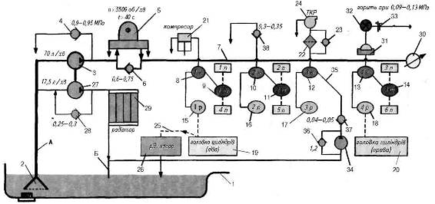 1 – піддон блок-картера; 2 – маслозабірник з сітчастим фільтром; 3 – основна секція масляного насоса; 4 – редукційний клапан; 5 – повнопоточна центрифуга; 6 – перепускний клапан; 7 – головна масляна магістраль; 8, 10, 12, 13 – корінні підшипники колінчастого вала; 9, 11; 14 – шатунні підшипники колінчастого вала; 15, 16, 17, 18 – опорні підшипники колінчастого вала; 19 – ліва головка циліндрів; 20 – права головка циліндрів; 21 – повітряний компресор; 22 – масляний фільтр турбокомпресора; 23 – перепускний клапан; 24 – турбокомпресор; 25 – маслопровід; 26 – рідинний насос; 27 – радіаторна секція масляного насоса; 28 – редукційний клапан; 29 – радіатор; ЗО – манометр; 31 – датчик аварійного тиску; 32 – лампочка; 33 – акумуляторна батарея; 34 – насос передпускового прокачування масла; 35 – похилий отвір; 36 – перепускнвй клапан; 37 – зворотний клапан; 38 – зливний клапан