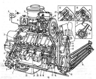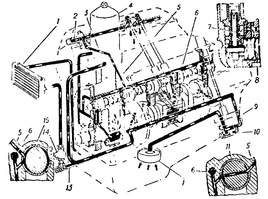 Система смазки включает масляный насос, фильтр очистки масла, центробежный фильтр очистки масла, масляный картер двигателя, воздушно-масляный радиатор, масляные каналы в блоке и головках цилиндров, передней крышке и картере маховика, клапаны для обеспечения нормальной работы системы, контрольные приборы, масляные трубопроводы и маслозаливную горловину.