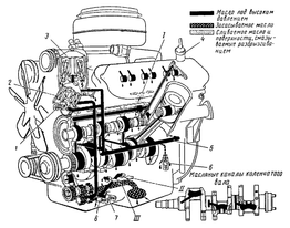 Из главной магистрали по каналам в блок цилиндров масло поступает к коренным подшипникам коленчатого вала и по отверстиям в его щеках поступает к шатунным подшипникам. Поступающее к шатунным подшипникам масло проходит дополнительную центробежную очистку в грязеуловительных полостях коленчатого вала. Одновременно масло по вертикальным каналам в блоке цилиндров поступает к опорным шейкам распределительного вала и по наклонным - к втулкам коромысел, а от них направляется к регулировочным винтам и верхним наконечникам штанг.