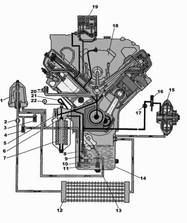 В смазочной системе этого двигателя масло из поддона картера 20 через неподвижный маслоприемник 22, нагнетается верхней секцией масляного насоса 3 и по маслопроводу 4 подается к фильтру (полнопоточная центрифуга) 8. При вращении ротора центрифуги происходит очистка масла, которое затем поступает в маслораспределительную камеру 5, расположенную в задней части блока цилиндров. Из камеры масло нагнетается в левый 11 и правый 21 магистральные каналы, а из них поступает к коренным подшипникам коленчатого вала, подшипникам распределительного вала и толкателям. В коленчатом валу имеются каналы 18 для подачи масла к шатунным подшипникам и грязеулавливающие полости 19 для предназначенные для очистки масла.