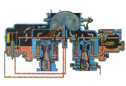 При полных нагрузках от двигателя требуется получение максимальной мощности, что возможно лишь в том случае, если в карбюраторе будет приготовлена обогащенная смесь, которая сгорает в цилиндре двигателя быстро, но неполно, в связи, с чем на этом режиме происходит некоторая потеря экономичности по сравнению с частичными нагрузками. При полной нагрузке двигателя воздушная заслонка 6, дроссельные заслонки 21 и 25 полностью открыты. Топливо под действием разрежения в малых диффузорах 3 и 11 из поплавковой камеры поступает в колодцы эмульсионных трубок 27 и 19 через топливные жиклеры 28 и 18. Поддержание необходимого состава смеси при увеличении расхода воздуха (увеличении числа оборотов коленчатого вала двигателя) осуществляется торможением топлива воздухом, поступающим в колодцы эмульсионных трубок через воздушные жиклеры 2 и 12. Образовавшаяся в колодцах эмульсионных трубок эмульсия, проходя через малые диффузоры, распыляется воздушным потоком. Схема работы карбюратора К-126 Г на режиме полной мощности показана на рисунке 2.
