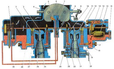 1 - ускорительный насос; 2 - главный воздушный жиклер вторичной камеры; 3 - малый диффузор вторичной камеры; 4 - балансировочный канал; 5 - распылитель экономайзера; 6 -воздушная заслонка; 7 - распылитель ускорительного насоса; 8 - нагнетательный (выпускной) клапан; 9 - кулисный механизм воздушной заслонки; 10 - воздушный жиклер холостого хода; 11 -малый диффузор первичной камеры; 12 - главный воздушный жиклер первичной камеры; 13 - топливный клапан; 14 - топливный фильтр; 15 – поплавок; 16 - смотровое окно; 17 - сливная пробка; 18 - главный топливный жиклер первичной камеры; 19 - эмульсионная трубка первичной камеры; 20 - рычаг привода дроссельных заслонок; 21 - дроссельная заслонка первичной камеры; 22 - переходное отверстие холостого хода; 23 - винт регулировки качества смеси; 24 - топливный жиклер холостого хода 25 - дроссельная заслонка вторичной камеры; 26 - большой диффузор; 27 - эмульсионная трубка вторичной камеры; 28 - главный топливный жиклер вторичной камеры; 29 - обратный (впускной) клапан.