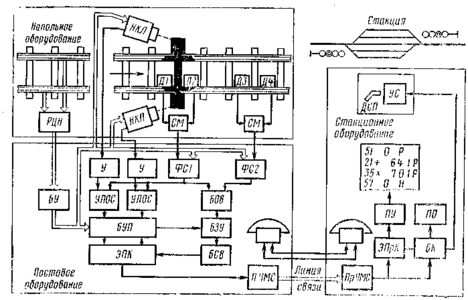При отсутствии поезда на участке контроля с РЦН поступает отрицательное напряжение на вход блока БУ, который выдает сигнал начальной установки на устройства перегонной части аппаратуры. В этом случае аппаратура находится во включенном состоянии, но заслонки напольных камер закрыты, схемы блоков удерживаются принудительно в исходном состоянии, а каретка печатающего устройства переведена в начало строки.