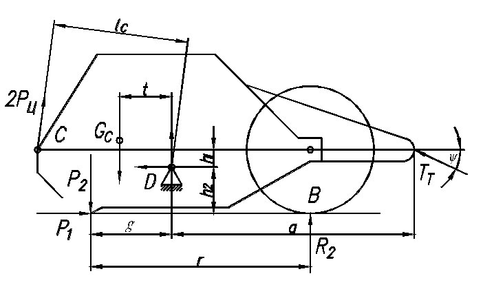 Кроме усилий в седельно-сцепном устройстве, на раму действуют нагрузки от механизма подъема и опускания ковша. Для определения усилий в механизме подъема рассмотрим равновесие ковша (Рисунок 2.3). Из суммы моментов относительно точки Д (точки крепления рамы к ковшу) находим неизвестное усилие 2РЦ:
