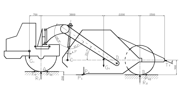 Определение нагрузок, действующих на раму скрепера, начнем с анализа внешних сил, действующих на машину в целом. Для этого рассмотрим схему сил, действующих на самоходный скрепер с одноосным тягачом. Величина сил, действующих на скрепер, различна для каждого периода работы, поэтому назначают ряд расчетных положений, для которых определяют силы, действующие на конструкцию. Расчетным положением для проверки на прочность рамы, деталей ковша, сцепного устройства и ходовой части будет являться конец заполнения ковша. В этом расчетном положении на машину действуют следующие силы: сила тяжести тягача GТ, сила тяги тягача ТР, толкающее усилие толкача ТТ, силы сопротивления копанию Р1 и Р2, вертикальные реакции на колесах R1 и R2, силы сопротивления перекатыванию Pf 1 и Pf 2. Величина и точка приложения силы тяжести тягача и скрепера с грунтом обычно заданы или находятся по общеизвестным правилам. Наибольшая возможная сила тяги определяется мощностью двигателя и условиями сцепления ведущего ходового устройства с грунтом. Расчетная сила тяги для самоходного скрепера равна: