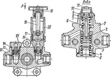 Рис. 9. Топливоподкачивающий насос: I — корпус, 2 — поршень, 3 — пружина, 4, 14 — прокладки, 5 — пробка пружины, 6 —■ втулка штока,' 7 — толкатель, 8 — стопорное кольцо, 9 — сухарь, 10 — ось, 11 — ролик, 12 — седло клапана, 13 — клапан, 15 — пробка, 16, 17 — корпус и поршень ручного насоса, 18 — шток, 19 — рукоятка, 20 — цилиндр