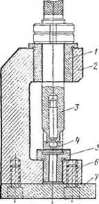 / — верхняя втулка, 2 — крон, штейн, 3 — оправка, 4 — поршень, 5 — нижняя втулка, в— вин-; крепления, 7 — плита.