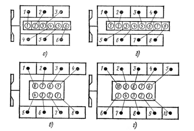 Рис. 14. Схемы соединения нагнетательных секций насосов высокого давления и форсунок двигателей: