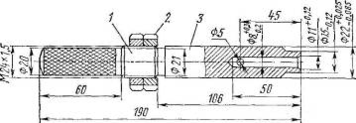 В ручном подкачивающем насосе в результате взноса чаще всего возникает люфт поршня 17 на штоке 18 (см. рис. 9); изнашиваются также рабочие поверхности поршня 17 и цилиндра 20. Для ремонта пары поршень — цилиндр используют метод перскомнлектовки деталей, так как завод-изготовитель выпускает три группы ручных насосов, позволяющих подбирать и доводить сопряжения до зазора 0,04 мм. При образовании люфта поршня на штоке более 0,25 мм поршень за- вальцовывают, применяя оправку (рис. 12) и приспособление для ограничения ее хода. Приспособление (рис. 13) в сборе с оправкой, штоком и поршнем помещают в гидравлический пресс, устанавливая гайками величину хода оправки под действием пресса. Если после за- вальцовки не удается восстановить требуемый люфт, берут новые поршень и шток и вновь выполняют завальцовку.