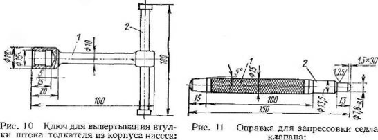 Топливоподкачивающий насос ремонтируют при износе поршня, штока и втулки толкателя, нарушении герметичности клапанов, неисправности ручного подкачивающего насоса. Перед ремонтом топливоподкачивающий насос (рис. 9) разбирают в поворотном приспособлении или в специальных тисках. Для этого закрепляют корпус 1 насоса, отвертывают пробку 15 и ручной насос в сборе, извлекая детали клапанов. Далее отвертывают пробку 5 пружины и вынимают из корпуса пружину 3 и поршень 2, снимают стопорное кольцо 8 толкателя и вынимают толкатель 7 в сборе. Затем специальным ключом (рис. 10) вывертывают втулку 6 (см. рис. 9) штока толкателя. Разборка толкателя и ручного насоса не сложна и не требует дополнительных приспособлений. После разборки детали насоса тщательно моют в керосине и дефектуют, обращая внимание на трущиеся поверхности цилиндров и поршней, штока толкателя и втулки, торцовые поверхности седел впускного и выпускного клапанов.