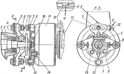 С целью упрощения регулирования угла опережения впрыскивания топлива на всех двигателях ЯМЗ заводом изменен привод насоса высокого давления. Новая конструкция привода (рис. 15) позволяет проверять и регулировать угол опережения впрыскивания без использования моментоскопа, только по меткам (метки у двигателей ЯМЭ-236,-238 нанесены на маховике и крышке шестерен распределительного вала). Для проверки или регулирования угла опережения впрыскивания топлива вручную вращают коленчатый вал двигателя до совмещения указанных меток, соответствующих установочному углу 21°. В момент их совмещения должны совместиться также метка а на торце муфты опережения впрыскивания топлива и риска б на указателе 12. Если этого не произошло, отпускают две гайки 6 и, не нарушая положения коленчатого вала, поворачивают кулачковый вал насоса до совмещения метки а и риски б. Затем затягивают гайки 6 болтов крепления ведущей полумуфты к пластинам. На этом регулирование заканчивается, а правильность установки угла опережения впрыскивания топлива проверяется еще раз путем проворачивания коленчатого вала и вторичного контроля совпадения всех меток.