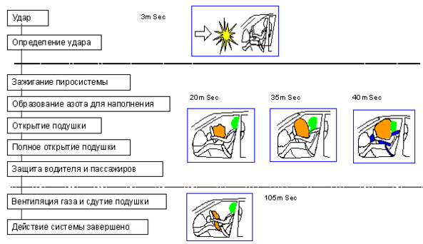 Воздушная подушка водителя имеет объём от 60 до 80 литров, а переднего пассажира – до 130 литров. Нетрудно представить, что при срабатывании системы, объём салона уменьшается на 200-250 литров в течение 0,04 сек(см. рисунок), что даёт немалую нагрузку на барабанные перепонки. Кроме того, вылетающая со скоростью более 300 км/ч подушка, таит в себе немалую опасность для людей, если они не пристёгнуты ремнём безопасности и ничто не задерживает инерционное движение тела навстречу подушке.