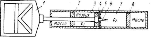 Стенд имеет две цилиндрические камеры: переднюю 3 и заднюю 7, разделенные перегородкой 5 с центральным отверстием. В передней камере размещены поршень 4 со штоком, соединенным с динамическими салазками 1. Между торцом поршня 4 и перегородкой 5 имеется специальное уплотнение по периметру отверстия. Для изменения давлений р1 и р2 предназначены плавающие поршни 2 и 8. В исходном состоянии система находится в равновесии, так как активная площадь со стороны большего давления р2 мала. При введении небольшого количества газа в пространство между перегородкой 5 и поршнем 4 равновесие нарушается, высокое давление р2 начинает действовать на всю площадь поршня, что приводит к быстрому разгону салазок 1 с закрепленным на них кузовом автомобиля или другим объектом испытаний. При моделировании лобового столкновения используют принцип реверсирования процесса удара, т. е. стоящий кузов резко разгоняют назад до скорости 113 км/ч, причем инерционные перегрузки достигают 40g. Ускорение разгона кузова можно изменять, управляя перепадом давлений в отверстии с помощью стержня переменного сечения 6. Описанный стенд можно использовать для исследований перегрузок, действующих на манекенов-пассажиров, для проверки работы оборудования салона автомобиля на соответствие требованиям пассивной безопасности и для оценки эффективности новых конструктивных решений по повышению травмобезопасности. Для испытаний кузовов и автомобилей на удар применяют также пружинную катапульту (рис. 2).