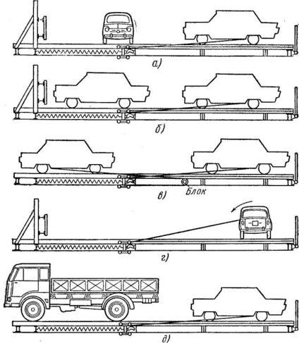 На катапульте натяжение пружин 2 осуществляют с помощью лебедки 5, после чего пружины запирают пневматическим спусковым механизмом 4. Максимальная масса испытываемого объекта равна 2200 кг. От спускового рычага 6 скорость движения объекта в момент столкновения с барьером 1 составляет 50 км/ч. На катапульте кузова и автомобили в сборе испытывают на различные виды столкновений (рис. 3). Возможно также испытание отдельных узлов кузова (например, передка). С этой целью узел закрепляют на динамической тележке 3 (рис. 2), а определенное, заранее выбранное торможение, обеспечивают специальным замедлителем.