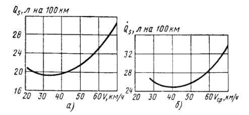 Аналогичным образом проводят заезды на всех заданных предельных скоростях движения. По полученным данным подсчитывают средние скорости и средние расходы топлива в каждом заезде. Результаты каждой пары заездов усредняют. По подсчитанным средним значениям скоростей и удельных расходов топлива (на единицу пути) для каждого ограничения скорости строят характеристики: скоростную, выражающую зависимость средней скорости от заданной предельной, и топливную, являющуюся зависимостью среднего расхода топлива от средней скорости (рис. 3, б).