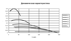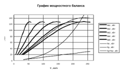 График силового баланса и все последующие графики будем строить в функции скорости автомобиля V, км/ч, которая связана с частотой вращения вала двигателя n зависимостью