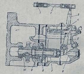Регулятор (рис. 5) – однорежимный центробежного типа. При увеличении числа оборотов валика 10 регулятора шарики 8, находящиеся в пазах ведущего диска 9, расходятся и отодвигают подвижный диск 7 вправо. Последний перемещает палец 6, и двуплечий рычаг 5 поворачивается на оси. Верхнее плечо рычага сжимает пружину 4, уравновешивая центробежную силу, действующую на шарики.