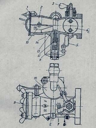 В патрубке 2 карбюратора установлены воздушная 15 и дроссельная 4 заслонки. Со стороны воздушной заслонки имеется крышка 9 с прокладкой 1, которая при неработающем двигателе плотно закрывает карбюратор. На оси дроссельной заслонки закреплены три рычага 3, 5 и 6. Нижний рычаг 5 соединен тягой с регулятором, а на рычаге 6 имеется винт 7 для регулировки малых оборотов коленчатого вала. Качество смеси на малых оборотах регулируют винтом 8. Рычаг 3 служит для ручного управления дроссельной заслонкой. Вместо карбюратора К-16 может быть установлен карбюратор К-16А.