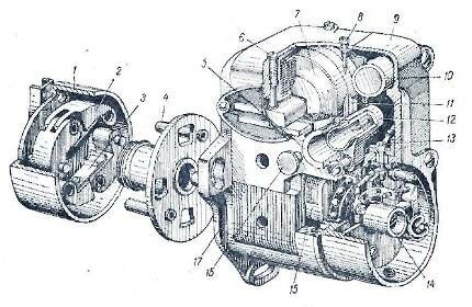 Карбюратор К-16 (рис. 4) – однодиффузорный с горизонтальным потоком и со сбалансированной поплавковой камерой. В средней части горизонтального патрубка сделано сужение, образующее диффузор 13 смесительной камеры. Поплавковая камера 14 сверху закрыта крышкой 10, прикрепленной двумя винтами. Поплавковая камера через канал, главный жиклер 11 и распылитель 12 сообщается с диффузором карбюратора. Кроме того, поплавковая камера сообщается через жиклер холостого хода с эмульсионными каналами около воздушной заслонки.