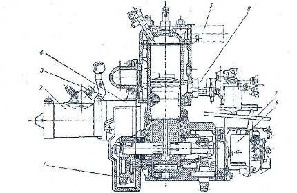 Двигатель ПД-10У (рис. 7) отличается от пускового двигателя ПД-10М2 лишь второстепенными деталями. Техническая характеристика двигателя приведена в табл. 1. Для его запуска применяют стартер СТ-350Б. Предусмотрена возможность его установки на дизели с правым и левым расположением пусковых двигателей. Маховик 1 имеет зубчатый венец и закрыт разъемным кожухом. К кожуху 4 прикреплен электрический стартер 2 с рукояткой 3 включения. Спереди двигателя установлены карбюратор 6, магнето 8 (М-24А) и патрубок 5. Под карбюратором закреплен щиток 7 для защиты магнето от попадания топлива.
