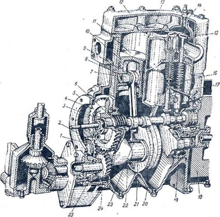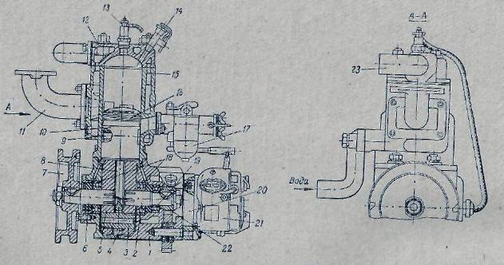 Кривошипно-шатунный механизм. Картер 1 (рис. 3) состоит из двух чугунных половин, соединенных болтами. К передней части картера через плиту 20 прикреплены магнето 21 и регулятор.
