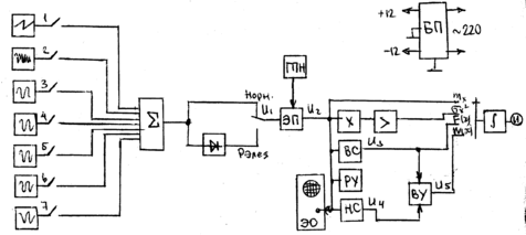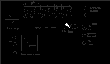 - сім джерел незалежних випадкових сигналів (одного шумового з нормальним розподілом, одного трикутного і п'ять гармонійних). Дисперсія випадкових сигналів регулюється відповідними потенціометрами ;