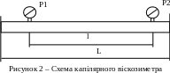 Основою капілярного віскозиметра є трубка з внутрішнім діаметром d (рис. 2). По трубці пропускається досліджувана рідина з відомою витратою Q. На робочій дільниці трубки вимірюється перепад тиску Δp = p1 – p2. Робоча дільниця повинна знаходитись на певній відстані від кінців, щоб виключити їх вплив. За звичай загальна довжина трубки L > 100d. Робоча дільниця l повинна знаходитись на такій відстані від кінців, щоб на ній виконувалась умова