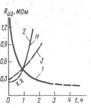 На Рис. 5.1 показаний графік зміни опору ізоляції електродвигуна типу А, встановленого відкрито, але захищеного навісом від дощу. Ця картина зміни опору ізоляції характерна і для приміщень з високою вологістю. Вимкнений електродвигун вбирає вологу в ті моменти часу, коли його температура виявляється нижчою за температуру навколишнього середовища. Як правило, чим більше пауза, тим меншим стають значення опору ізоляції обмоток. При наступному включенні (вхолосту) обмотка поступово нагрівається струмом, що проходить по ній: опір ізоляції відновлюється. Включення ж під навантаженням яке приведе до швидшого нагріву обмотки, опір її ізоляції може знизитися ще більше і виникне пробій: двигун вийде з ладу.