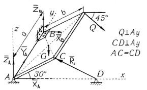3) ∑FKZ=ZA+ZB+RC·sin30°-G-Q·cos45°=0;
