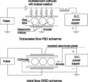 Несамостоятельный тлеющий разряд постоянного тока с ионизацией импульсно-периодическим разрядом (РПТ-ИР) используется для создания активной среды в электроразрядных технологических СО2-лазерах с быстрым поперечным протоком газа с непрерывной мощностью от 1 до 40 кВт. Этот метод был впервые использован для накачки СО2-лазеров в работах Рейли[1] и Хилла[2], о значительных практических достижениях сообщали Шашаков с сотр. [3], Сеген с сотр. [4], а также Генералов с сотр. [4]
