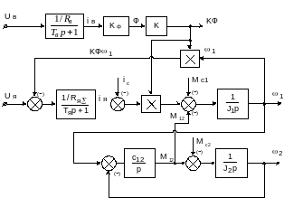 В двухмассовой системе двигатель подключается к нагрузке через упругое звено. Структурная схема такого включения изображена на рис. 15.