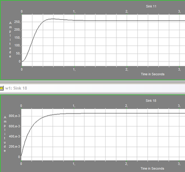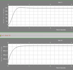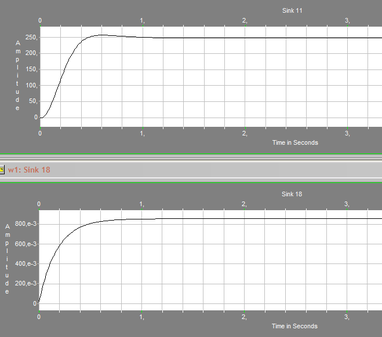 С помощью данной схемы смоделируем поведение двухмассовой упругой электромеханической системы с двигателем постоянного тока независимого возбуждения. На входы схемы Мс1 и Мс2 подаем значения Мс1 = Мс2 = 0. Остальные параметры – номинальные. С выхода схемы снимаем переходную характеристику угловой скорости вращения рабочего органа