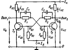 За счет положительной обратной связи в схеме начнется регенеративный процесс. Ток коллектора iK закрывающегося транзистора Tt будет уменьшаться. За счет этого будет более отрицательным потенциал коллектора Ti. Небольшой отрицательный скачок напряжения на коллекторе транзистора Tt через резистор обратной связи Rt приложится к базе транзистора Т2 и приоткроет его. Это вызовет значительное увеличение тока коллектора iK2 транзистора Т2 за счет большого коэффициента усиления по току в схеме с ОЭ (H2i3 ~ P) – Потенциал коллектора транзистора Т2, равный ц>К2=ик2=–Ек +RKiK2, станет положительнее, и положительный скачок напряжения на коллекторе Т2 будет значительно больше вызвавшего его отрицательного скачка напряжения на коллекторе транзистора Ti. Усиленный положительный скачок напряжения через резистор обратной связи R2 приложится к базе транзистора Ti и еще более призакроет его и т.д. Процесс будет развиваться лавинообразно и закончится закрыванием открытого транзистора Ti и открыванием закрытого транзистора Т2. Чтобы вывести схему из этого устойчивого состояния, нужно подать запускающий импульс на базу открытого теперь транзистора Т2.