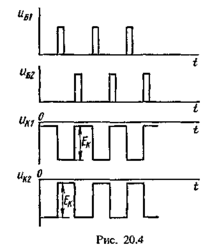 Отметим, что конденсатор С2 после опрокидывания схемы будет перезаряжаться и напряжение на нем к концу перезарядки станет равным иК2 ~ 0. При лавинообразном процессе напряжение на конденсаторах не изменяется. Таким образом, они представляют собой коротко замкнутые участки цепи, т.е. шунтируют резисторы Rt и R2. Поэтому скачки напряжения на коллекторе одного транзистора почти полностью прикладываются к базе другого транзистора. Если бы не было конденсаторов, часть напряжения скачков падала бы на резисторах Rt u.R2 и токи базы, коллектора, а соответственно, и скачки напряжения были бы меньше, а процесс – более длительным. На рис. 20.4, б показаны входные импульсы мвх1 и мвх2 и напряжения иК1 и иК2 на коллекторах транзисторов 7i и Т2. Амплитуда выходного импульса равна перепаду напряжения на коллекторе при переходе триггера из одного устойчивого состояния в другое. Когда транзистор открыт, напряжение на его коллекторе = 0; когда транзистор закрыт, иК1шкъ – Ек. Таким образом, амплитуда выходного импульса будет равна примерно Ек.