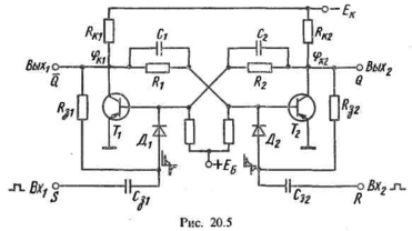 Раздельный запуск осуществляется подачей импульсов одной полярности поочередно на базы транзисторов (входы триггеров). Импульс, поданный на один из входов, устанавливает триггер в одно из устойчивых состояний. Импульс, подаваемый на другой вход, устанавливает триггер в противоположное устойчивое состояние. Схема триггера с раздельным запуском с подачей запускающих импульсов на базы через диоды показана на рис. 20.5.
