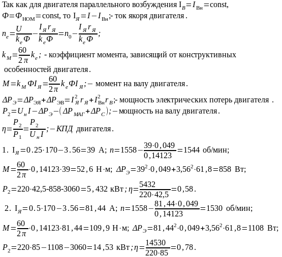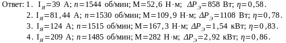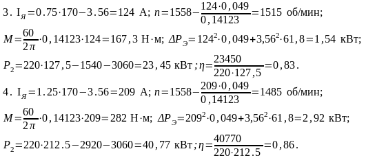 Определить ток якоря, момент на валу двигателя и частоту вращения якоря при токах двигателя, равных 0,25; 0,5; 0,75; 1,25 Iн. Рассчитать для этих режимов мощность электрических потерь и КПД двигателя, считая мощность механических и магнитных потерь не зависящей от нагрузки.